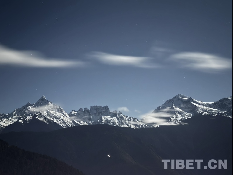 Des montagnes argentées de la lune à minuit du 16 novembre au-dessus des montagnes enneigées de Minling