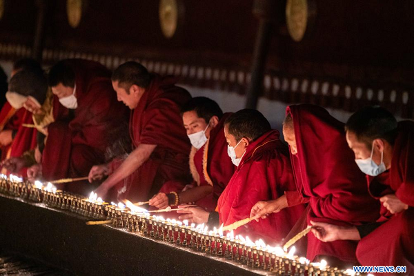 Des moines allument des lampes à beurre au temple de Jokhang, à Lhassa, capitale de la région autonome du Xizang, dans le sud-ouest de la Chine, le 25 décembre 2024.