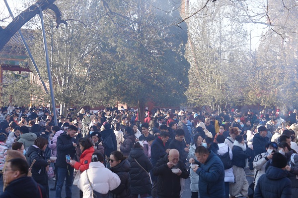 En photo : Les visiteurs patientant devant l'entrée du temple Yonghe pour se voir servir de la bouillie de Laba.