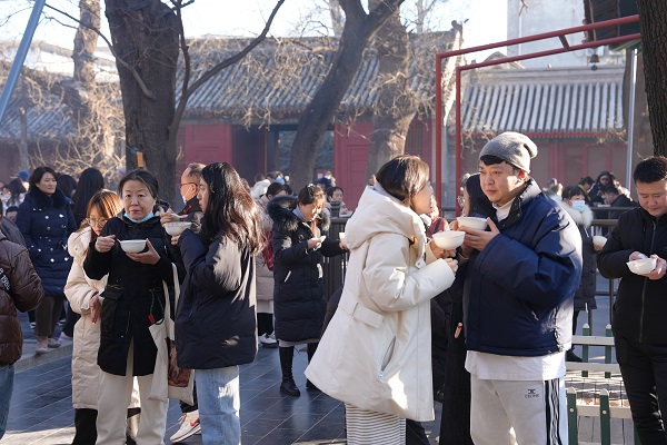 Le 7 janvier, correspondant au huitième jour du douxième mois du calendrier lunaire, marque la fête traditionnelle chinoise de Laba. La coutume de distribution de bouillie de Laba au temple Yonghe de Beijing attire de nombreux visiteurs. Ce matin-là, une longue file de personnes s'étendait devant le temple, attendant de recevoir un bol de bouillie de Laba chaud et fumant. ( La bouille de Laba est une délicieuse concoction de céréales, d'arachides, de chataignes, de dattes rouges, de graines de lotus et d'autres ingrédients.)