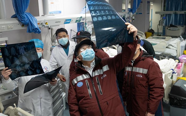 Des professionnels de santé de l'H?pital de l'ouest de la Chine de l'Université du Sichuan et des médecins locaux examinent les radios de personnes blessées dans un séisme à l'H?pital populaire de Xigaze, dans la ville de Xigaze de la région autonome du Xizang, dans le sud-ouest de la Chine, le 7 janvier 2025.(Photo : Tenzin Nyida)