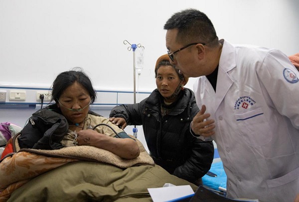 Un médecin interroge une femme blessée dans un séisme à l'H?pital populaire de Xigaze, dans la ville de Xigaze de la région autonome du Xizang, dans le sud-ouest de la Chine, le 7 janvier 2025. (Photo : Tenzin Nyida)