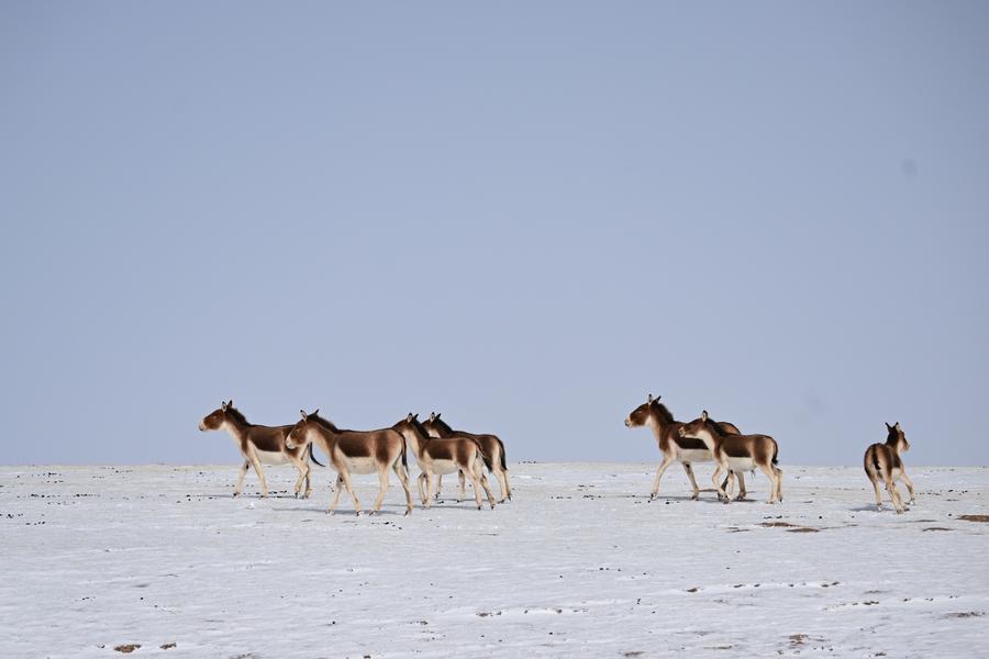 Des anes sauvages tibétains dans une prairie enneigée dans la préfecture autonome tibétaine de Golog, dans la province chinoise du Qinghai (nord-ouest), le 6 mars 2025. (Photo : Zhang Long)