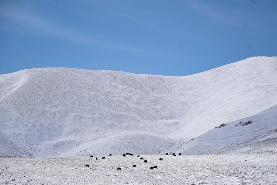 Des yaks dans une prairie enneigée dans la préfecture autonome tibétaine de Golog, dans la province chinoise du Qinghai (nord-ouest), le 8 mars 2025. (Photo : Zhang Long)