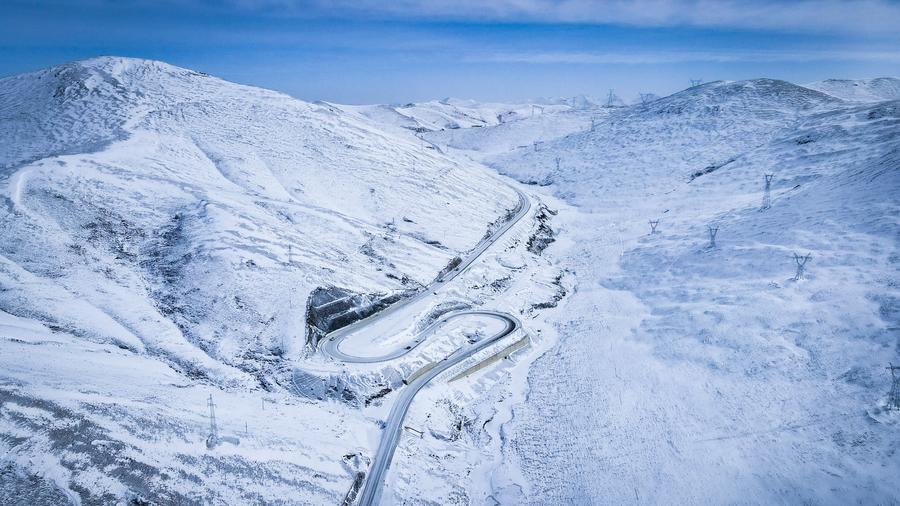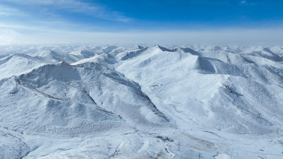 Photo aérienne du paysage enneigée dans le district de Gande de la préfecture autonome tibétaine de Golog, dans la province chinoise du Qinghai (nord-ouest), le 8 mars 2025. (Photo : Qi Zhiyue)