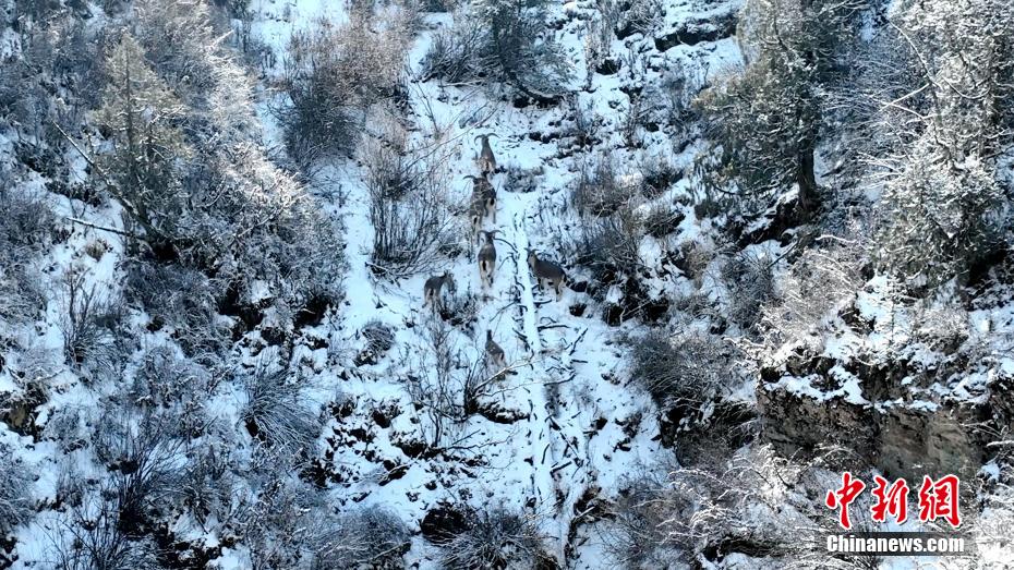 • Chutes de neige propice dans l'arrière-pays des monts Qilian : les bharals ? font une promenade printanière ? en quête de nourriture
