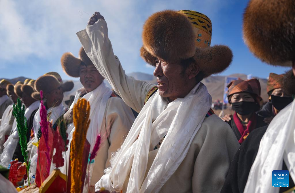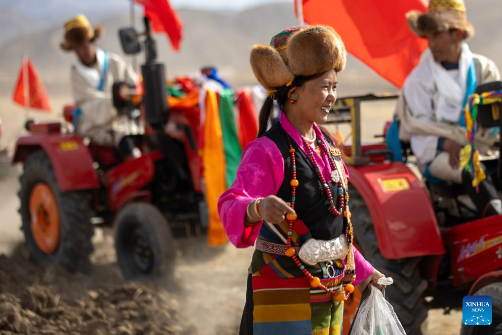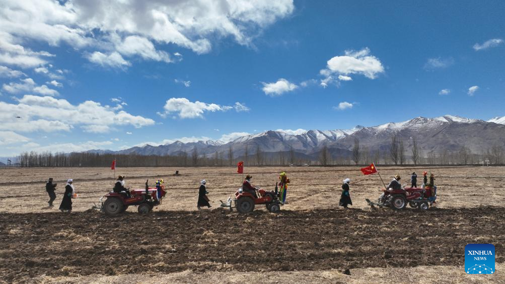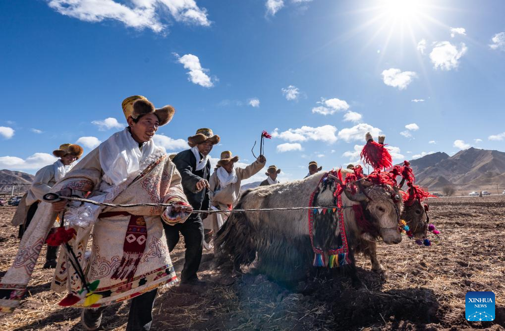 Des agriculteurs participent à une cérémonie marquant le début des travaux agricoles de printemps dans le canton de Codoi du comté de Lhunzhub, à Lhassa, capitale de la région autonome du Xizang (sud-ouest de la Chine), le 16 mars 2025. Des cérémonies marquant le début des travaux agricoles de printemps ont eu lieu dimanche dans tout le Xizang. Elles revêtent une grande signification car elles marquent le début de la saison agricole de la nouvelle année tout en servant de prière pour un temps favorable et des récoltes abondantes. Ces cérémonies sont considérées comme un rituel important dans les régions agricoles du Xizang.