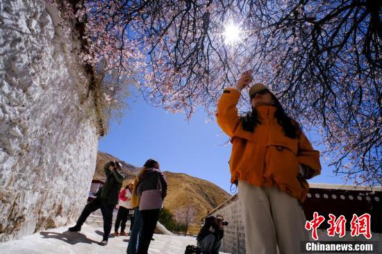 Photo d'une vue des ? fleurs de pêcher du temple ancien ? au temple de Pabongka, dans la banlieue nord de Lhassa, attirant habitants et touristes pour une séance photo pour les réseaux sociaux.