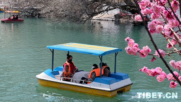 Des visiteurs profitent d'une promenade en barque au parc Dzongyab Lukhang, sous un ciel printanier radieux.