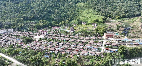 Vue aérienne du village de Dêxing, du canton de Dêxing, du comté de Mêdog