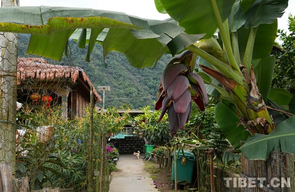 Un bananier devant la maison d'un villageois de Dêxing, dans le canton de Dêxing, du comté de Mêdog