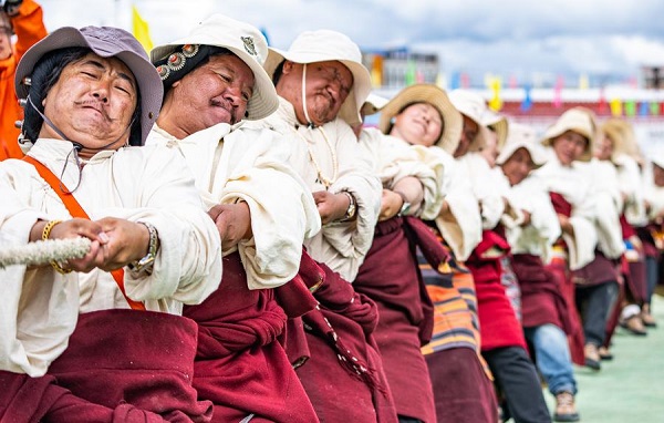 Des concurrents participent à un jeu de tir à la corde lors de l'édition 2025 d'un festival traditionnel de courses hippiques à Nagqu, dans la région autonome du Xizang (sud-ouest de la Chine), le 6 septembre 2025. (Photo : Jiang Fan)