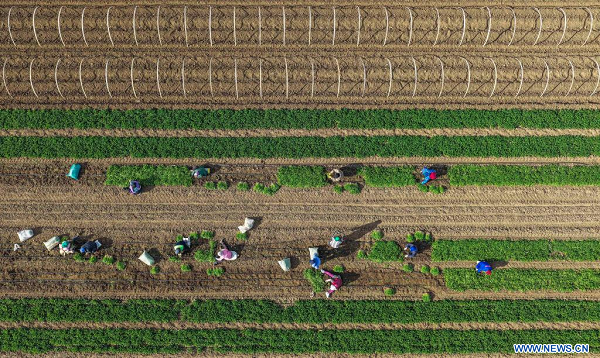 Photo aérienne prise par un drone le 18 novembre 2025 d'agriculteurs récoltant de la coriandre à Tangshan, ville de la province du Hebei, dans le nord de la Chine. (Photo : Liu Mancang)