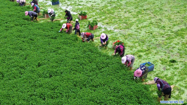 Photo aérienne prise par un drone le 19 novembre 2025 d'agriculteurs récoltant des légumes à Hezhou, ville de la région autonome Zhuang du Guangxi, dans le sud de la Chine. (Photo : Liao Zuping)